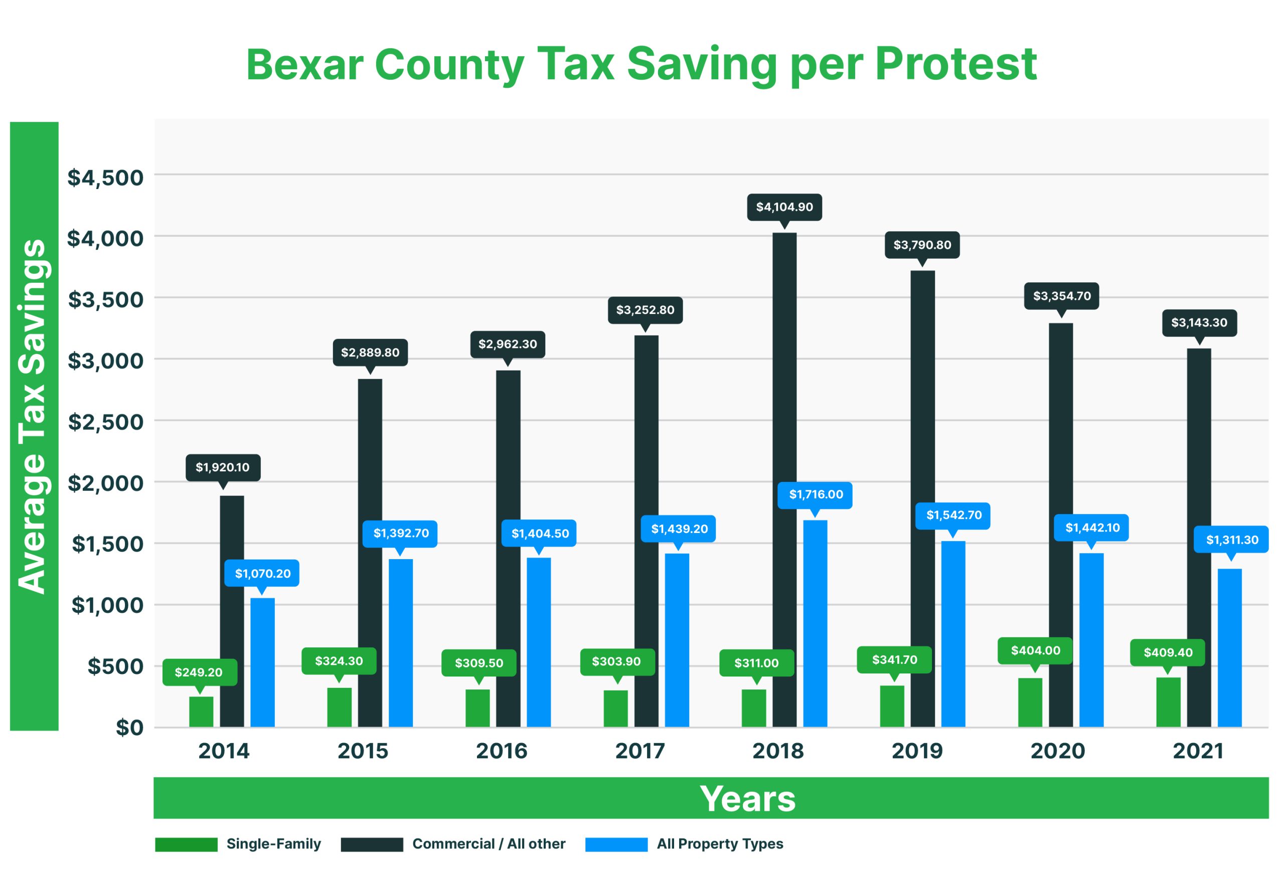 The typical savings for Bexar County homeowners who protested averaged $409, compared to the statewide average of $527 from informal/ARB hearings. In 2021, commercial property owners in Bexar County realized an average savings of $3,143, although the statewide average savings per commercial tax protest was $4,086. Participating in tax protests offers notable advantages, resulting in considerable savings.