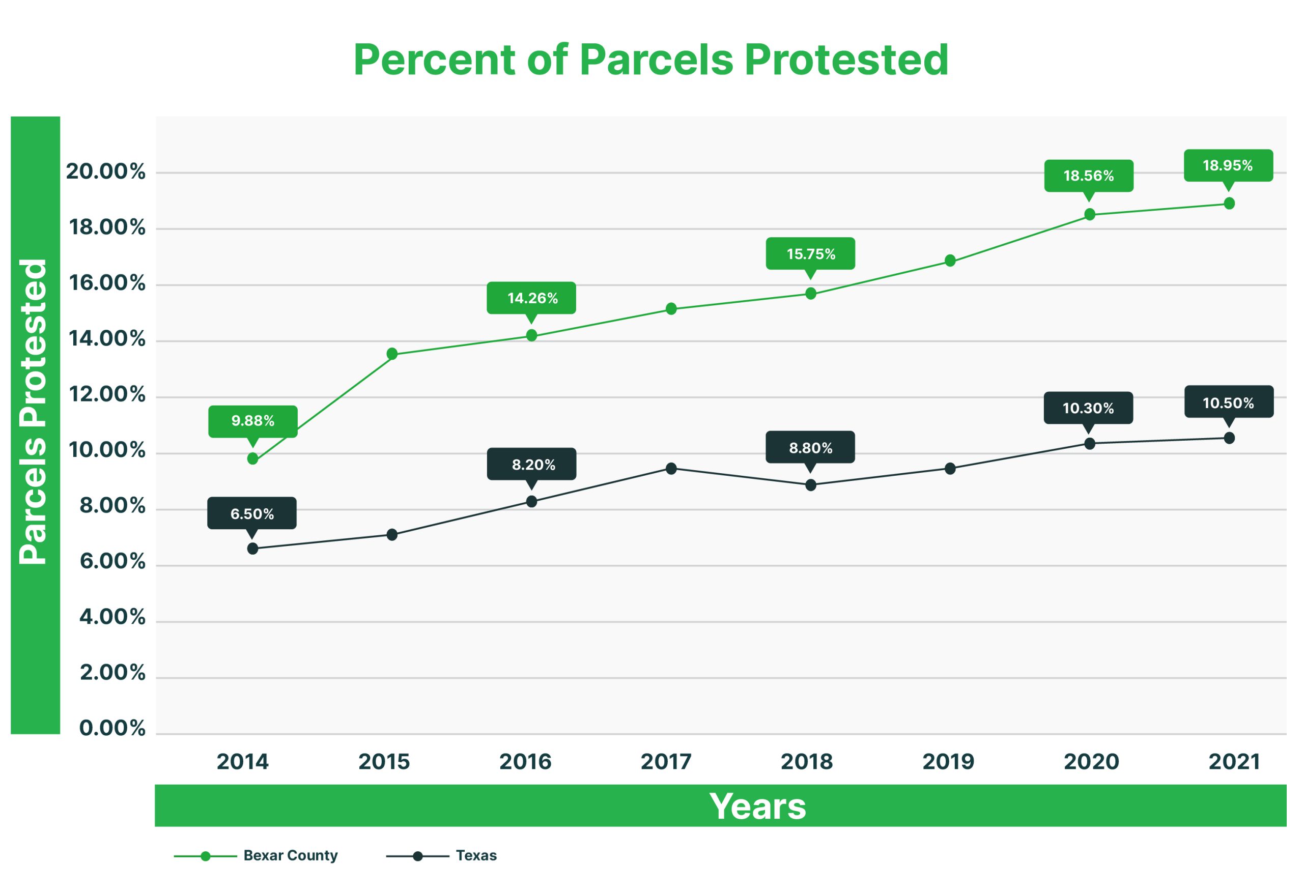 In 2021, Texas saw 2,191,000 tax parcels protested out of 20,960,000 statewide, a notable increase from the 6.5% protest rate in 2014. In Bexar County, out of 721,060 accounts, 136,650 were protested, marking a jump from 9.88% to 18.95% since 2014.