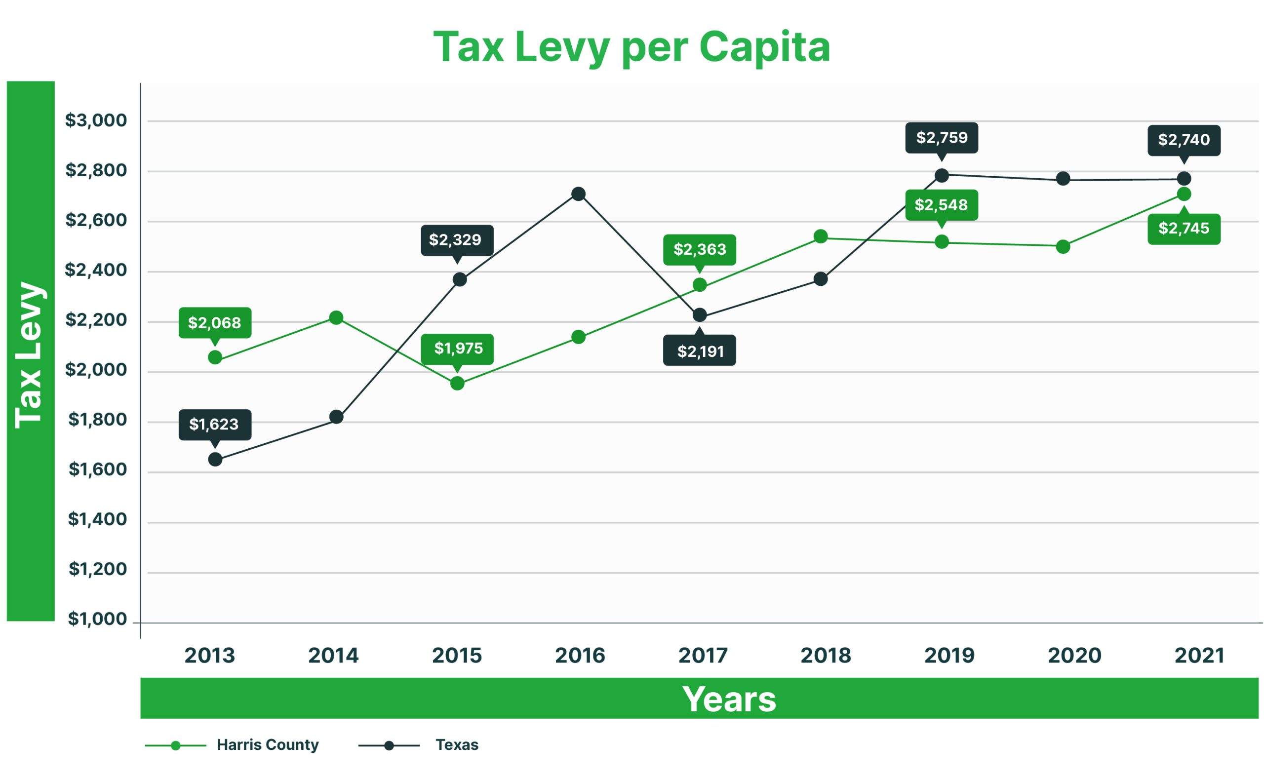 The total Harris County property tax levy rose from $9 billion in 2013 to $13 billion in 2021, a 33% increase. The per capita property tax levy rose more quickly than population, indicating a high rate of property tax growth, which eventually in Senate Bill 2 which capped the the property tax levy growth to 3.5% for cities and counties (3.5% plus new construction) and 2.5% for schools plus new construction.
