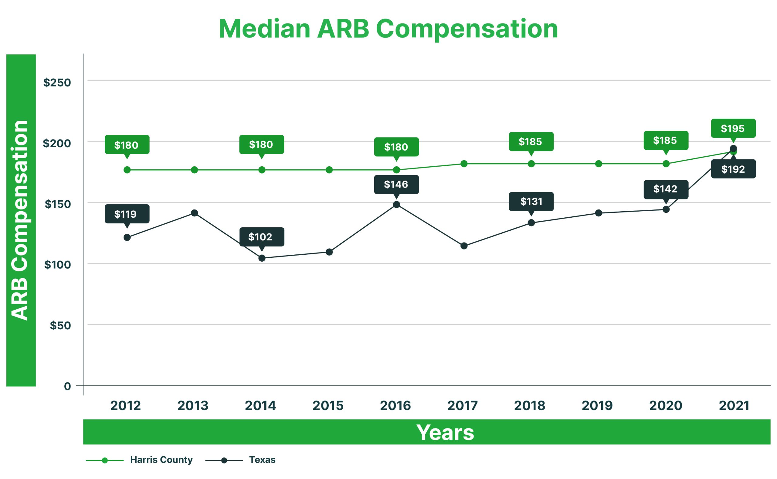 Appraisal Review Boards in all counties pay appraisal review members to hear tax protests not resolved at the informal hearings. In Texas’ largest counties, the ARB meets 5 or 6 days a week for and extended period; many months. Harris County and Hays County tied for first place in highest number of ARB hearings in 2021 with 158 days of ARB hearings. The next 8 highest were: 3) Comal – 100 days, 4) El Paso – 97 days, 5) Tarrant – 90 days, 6) Johnson 86 days, 7) Montgomery – 82 days, 8) Victoria – 80 days, 9) Travis – 71 days and 10) Galveston- 73 days.