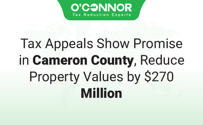 Proudly, we at O’Connor were able to secure great results for our clients across Cameron County. The county has been one of our main points of focus, and we have been getting solid results. We were easily able to beat the overall reduction numbers across the county and managed to reduce our clients’ taxable value by $32.66 million. There is no fee or charge to join O’Connor, and we will protest your taxes to the appropriate level every year. You will only be charged a contingency fee from your savings if you win, even in a lawsuit or judicial appeal.